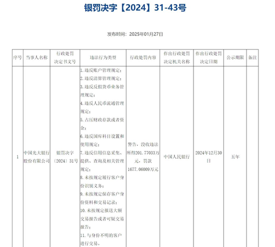 其中,光大银行在2024年底收到了央行的千万罚单,涉及的问题主要有违反账户管理规定、违反清算管理规定、违反反假货币业务管理规定等10项内容。