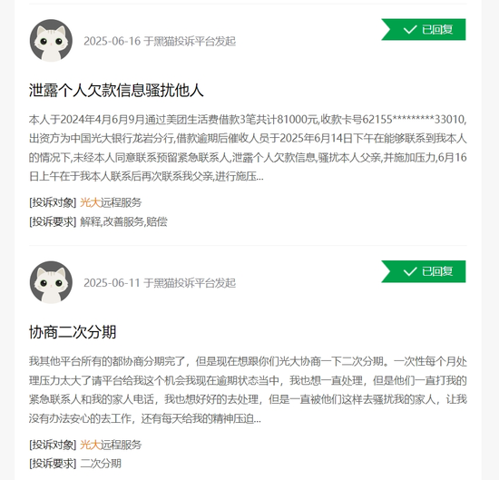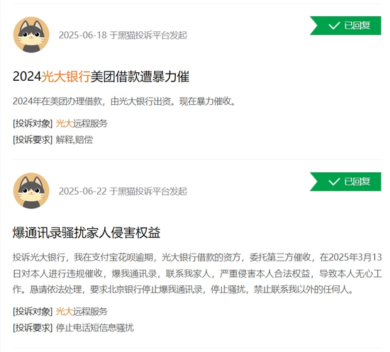 对光大银行的投诉中,信用卡业务的相关投诉占不少比例,涉及暴力催收、还款信息泄露等。
