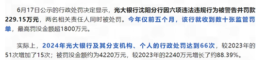 近期,光大银行沈阳分行因违反相关规定被罚款近230万元。这一情况并非偶然,今年前五个月,公司已收到更多监管罚单。不仅如此,光大银行遭行政处罚的次数和金额这两年都呈现较快的增长态势。