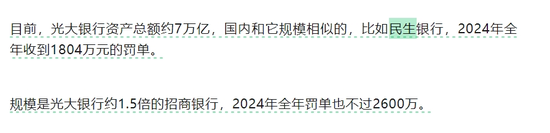 罚款金额之多,横向对比看得更明显。有媒体统计,2024年光大银行收到的罚单金额累计约为4220万元,远超资产规模相似的民生银行(1804万元),也远超规模是光大银行1.5倍的招商银行(2600万元)。