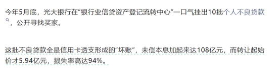 今年5月底,光大银行在银行业信贷资产登记流转中心一口气挂出10批个人不良贷款,有媒体统计,未偿本息合计金额高达108亿元,转让起始价仅6亿元左右,损失率高达90%以上。