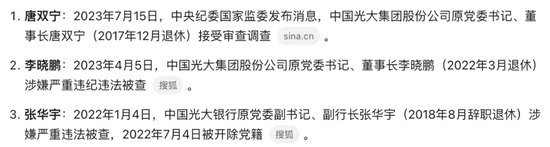 此外,近两三年来,光大银行原董事长李晓鹏、唐双宁,以及原副行长张华宇等相继落马,也让光大银行承受不小的压力。