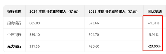 其中,光大银行2024年信用卡业务收入同比下滑23%,而这方面业务做的比较好的招行,能够逆势增长,中信银行下滑幅度不足6%,远低于光大银行的跌幅。