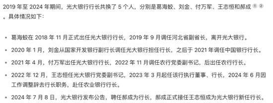2019年-2024年,短短五年时光,光大银行行长已经换了五任。行长的频繁变更,一般会对银行发展战略的一致性有所影响。