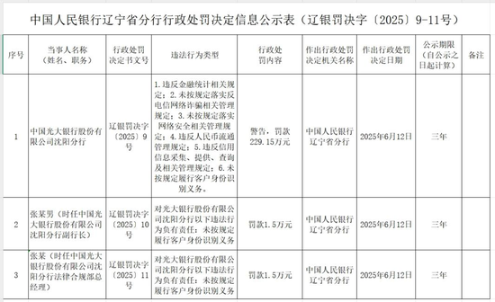 与此同时,光大银行沈阳分行时任副行长、时任法律合规部总经理皆因对沈阳分行的违法行为负有责任,以及未按规定履行客户身份识别义务被罚款。