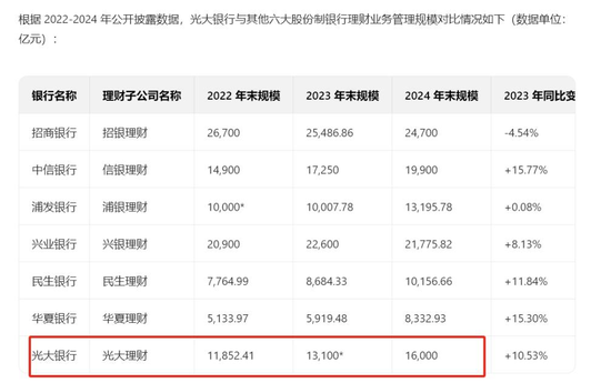 2022-2024年,光大银行理财业务虽然规模增长,但仍旧被招银、兴银、信银理财超越,且净利润2024年上半年被平安理财反超,被甩至第一梯队边缘位置。